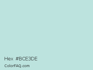 Hex #bce3de Color is a very light cyan color and the nearest color is Ziggurat #bfdbe2. Hex code #bce3de and RGB value is rgb(188,227,222). In RGB color space, this color is composed of 74% red, 89% green, 87% blue, In CMYK color space, this color is composed of 17% cyan, 0% magenta, 2% yellow , 11% black , In HSL color space, this color has a hue angle of 172° , 41% saturation and 81% lightness.
