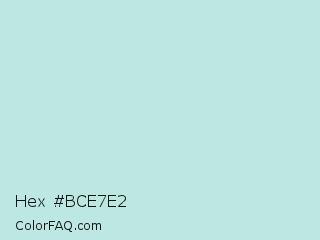 Hex #bce7e2 Color is a very light cyan color and the nearest color is Jagged Ice #c2e8e5. Hex code #bce7e2 and RGB value is rgb(188,231,226). In RGB color space, this color is composed of 74% red, 91% green, 89% blue, In CMYK color space, this color is composed of 19% cyan, 0% magenta, 2% yellow , 9% black , In HSL color space, this color has a hue angle of 173° , 47% saturation and 82% lightness.