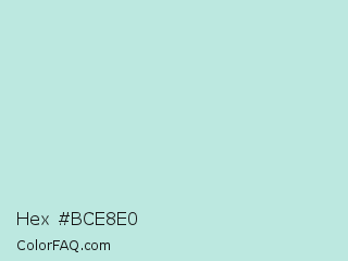 Hex #bce8e0 Color is a very light cyan color and the nearest color is Jagged Ice #c2e8e5. Hex code #bce8e0 and RGB value is rgb(188,232,224). In RGB color space, this color is composed of 74% red, 91% green, 88% blue, In CMYK color space, this color is composed of 19% cyan, 0% magenta, 3% yellow , 9% black , In HSL color space, this color has a hue angle of 169° , 49% saturation and 82% lightness.