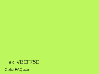 Hex #bcf75d Color is a light green color and the nearest color is Inchworm #b2ec5d. Hex code #bcf75d and RGB value is rgb(188,247,93). In RGB color space, this color is composed of 74% red, 97% green, 36% blue, In CMYK color space, this color is composed of 24% cyan, 0% magenta, 62% yellow , 3% black , In HSL color space, this color has a hue angle of 83° , 91% saturation and 67% lightness.