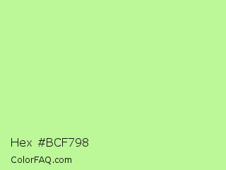 Hex #bcf798 Color is a light green color and the nearest color is Reef #c9ffa2. Hex code #bcf798 and RGB value is rgb(188,247,152). In RGB color space, this color is composed of 74% red, 97% green, 60% blue, In CMYK color space, this color is composed of 24% cyan, 0% magenta, 38% yellow , 3% black , In HSL color space, this color has a hue angle of 97° , 86% saturation and 78% lightness.