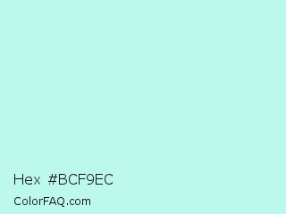 Hex #bcf9ec Color is a very light cyan color and the nearest color is Mint Tulip #c4f4eb. Hex code #bcf9ec and RGB value is rgb(188,249,236). In RGB color space, this color is composed of 74% red, 98% green, 93% blue, In CMYK color space, this color is composed of 24% cyan, 0% magenta, 5% yellow , 2% black , In HSL color space, this color has a hue angle of 167° , 84% saturation and 86% lightness.