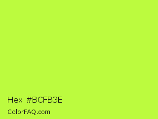 Hex #bcfb3e Color is a light green color and the nearest color is Green Yellow #adff2f. Hex code #bcfb3e and RGB value is rgb(188,251,62). In RGB color space, this color is composed of 74% red, 98% green, 24% blue, In CMYK color space, this color is composed of 25% cyan, 0% magenta, 75% yellow , 2% black , In HSL color space, this color has a hue angle of 80° , 96% saturation and 61% lightness.