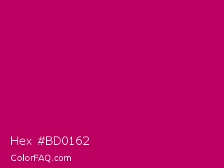 Hex #bd0162 Color is a normal rose color and the nearest color is Lipstick #ab0563. Hex code #bd0162 and RGB value is rgb(189,1,98). In RGB color space, this color is composed of 74% red, 0% green, 38% blue, In CMYK color space, this color is composed of 0% cyan, 99% magenta, 48% yellow , 26% black , In HSL color space, this color has a hue angle of 329° , 99% saturation and 37% lightness.