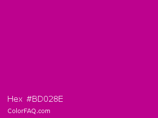 Hex #bd028e Color is a normal magenta color and the nearest color is Red Violet #c71585. Hex code #bd028e and RGB value is rgb(189,2,142). In RGB color space, this color is composed of 74% red, 1% green, 56% blue, In CMYK color space, this color is composed of 0% cyan, 99% magenta, 25% yellow , 26% black , In HSL color space, this color has a hue angle of 315° , 98% saturation and 37% lightness.