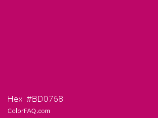 Hex #bd0768 Color is a normal rose color and the nearest color is Lipstick #ab0563. Hex code #bd0768 and RGB value is rgb(189,7,104). In RGB color space, this color is composed of 74% red, 3% green, 41% blue, In CMYK color space, this color is composed of 0% cyan, 96% magenta, 45% yellow , 26% black , In HSL color space, this color has a hue angle of 328° , 93% saturation and 38% lightness.