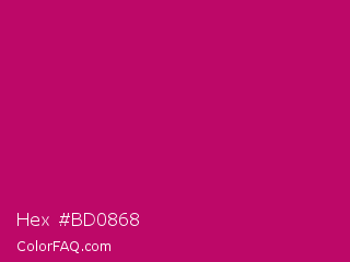Hex #bd0868 Color is a normal rose color and the nearest color is Lipstick #ab0563. Hex code #bd0868 and RGB value is rgb(189,8,104). In RGB color space, this color is composed of 74% red, 3% green, 41% blue, In CMYK color space, this color is composed of 0% cyan, 96% magenta, 45% yellow , 26% black , In HSL color space, this color has a hue angle of 328° , 92% saturation and 39% lightness.