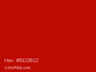 Hex #bd0b02 Color is a normal red color and the nearest color is Milano Red #b81104. Hex code #bd0b02 and RGB value is rgb(189,11,2). In RGB color space, this color is composed of 74% red, 4% green, 1% blue, In CMYK color space, this color is composed of 0% cyan, 94% magenta, 99% yellow , 26% black , In HSL color space, this color has a hue angle of 3° , 98% saturation and 37% lightness.