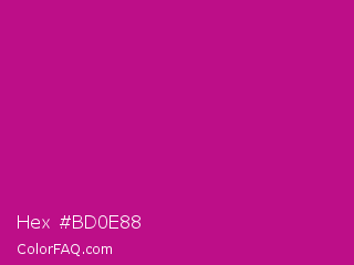 Hex #bd0e88 Color is a normal magenta color and the nearest color is Red Violet #c71585. Hex code #bd0e88 and RGB value is rgb(189,14,136). In RGB color space, this color is composed of 74% red, 5% green, 53% blue, In CMYK color space, this color is composed of 0% cyan, 93% magenta, 28% yellow , 26% black , In HSL color space, this color has a hue angle of 318° , 86% saturation and 40% lightness.