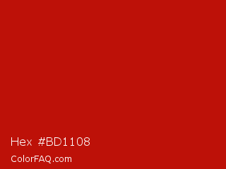 Hex #bd1108 Color is a normal red color and the nearest color is Milano Red #b81104. Hex code #bd1108 and RGB value is rgb(189,17,8). In RGB color space, this color is composed of 74% red, 7% green, 3% blue, In CMYK color space, this color is composed of 0% cyan, 91% magenta, 96% yellow , 26% black , In HSL color space, this color has a hue angle of 3° , 92% saturation and 39% lightness.