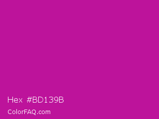 Hex #bd139b Color is a normal magenta color and the nearest color is Red Violet #c71585. Hex code #bd139b and RGB value is rgb(189,19,155). In RGB color space, this color is composed of 74% red, 7% green, 61% blue, In CMYK color space, this color is composed of 0% cyan, 90% magenta, 18% yellow , 26% black , In HSL color space, this color has a hue angle of 312° , 82% saturation and 41% lightness.