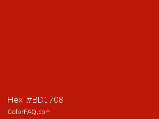 Hex #bd1708 Color is a normal red color and the nearest color is International Orange Engineering #ba160c. Hex code #bd1708 and RGB value is rgb(189,23,8). In RGB color space, this color is composed of 74% red, 9% green, 3% blue, In CMYK color space, this color is composed of 0% cyan, 88% magenta, 96% yellow , 26% black , In HSL color space, this color has a hue angle of 5° , 92% saturation and 39% lightness.