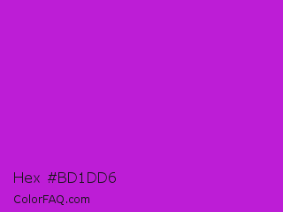 Hex #bd1dd6 Color is a normal magenta color and the nearest color is Vivid Mulberry #b80ce3. Hex code #bd1dd6 and RGB value is rgb(189,29,214). In RGB color space, this color is composed of 74% red, 11% green, 84% blue, In CMYK color space, this color is composed of 12% cyan, 86% magenta, 0% yellow , 16% black , In HSL color space, this color has a hue angle of 292° , 76% saturation and 48% lightness.
