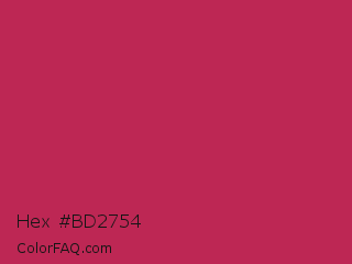 Hex #bd2754 Color is a normal rose color and the nearest color is Rose Red #c21e56. Hex code #bd2754 and RGB value is rgb(189,39,84). In RGB color space, this color is composed of 74% red, 15% green, 33% blue, In CMYK color space, this color is composed of 0% cyan, 79% magenta, 56% yellow , 26% black , In HSL color space, this color has a hue angle of 342° , 66% saturation and 45% lightness.