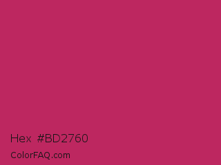 Hex #bd2760 Color is a normal rose color and the nearest color is Rose Red #c21e56. Hex code #bd2760 and RGB value is rgb(189,39,96). In RGB color space, this color is composed of 74% red, 15% green, 38% blue, In CMYK color space, this color is composed of 0% cyan, 79% magenta, 49% yellow , 26% black , In HSL color space, this color has a hue angle of 337° , 66% saturation and 45% lightness.
