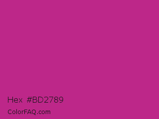 Hex #bd2789 Color is a normal magenta color and the nearest color is Medium Red Violet #bb3385. Hex code #bd2789 and RGB value is rgb(189,39,137). In RGB color space, this color is composed of 74% red, 15% green, 54% blue, In CMYK color space, this color is composed of 0% cyan, 79% magenta, 28% yellow , 26% black , In HSL color space, this color has a hue angle of 321° , 66% saturation and 45% lightness.