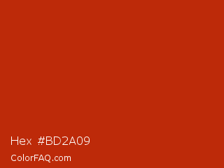 Hex #bd2a09 Color is a normal red color and the nearest color is Thunderbird #c02b18. Hex code #bd2a09 and RGB value is rgb(189,42,9). In RGB color space, this color is composed of 74% red, 16% green, 4% blue, In CMYK color space, this color is composed of 0% cyan, 78% magenta, 95% yellow , 26% black , In HSL color space, this color has a hue angle of 11° , 91% saturation and 39% lightness.