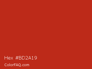 Hex #bd2a19 Color is a normal red color and the nearest color is Thunderbird #c02b18. Hex code #bd2a19 and RGB value is rgb(189,42,25). In RGB color space, this color is composed of 74% red, 16% green, 10% blue, In CMYK color space, this color is composed of 0% cyan, 78% magenta, 87% yellow , 26% black , In HSL color space, this color has a hue angle of 6° , 77% saturation and 42% lightness.