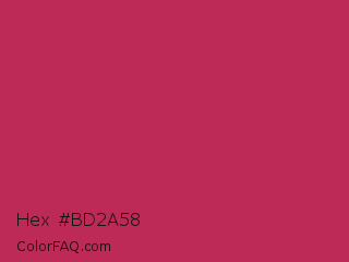 Hex #bd2a58 Color is a normal rose color and the nearest color is Dingy Dungeon #c53151. Hex code #bd2a58 and RGB value is rgb(189,42,88). In RGB color space, this color is composed of 74% red, 16% green, 35% blue, In CMYK color space, this color is composed of 0% cyan, 78% magenta, 53% yellow , 26% black , In HSL color space, this color has a hue angle of 341° , 64% saturation and 45% lightness.