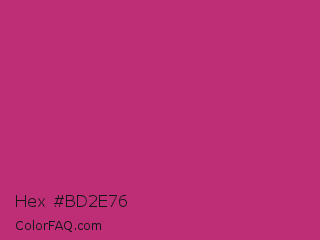 Hex #bd2e76 Color is a normal rose color and the nearest color is Hibiscus #b6316c. Hex code #bd2e76 and RGB value is rgb(189,46,118). In RGB color space, this color is composed of 74% red, 18% green, 46% blue, In CMYK color space, this color is composed of 0% cyan, 76% magenta, 38% yellow , 26% black , In HSL color space, this color has a hue angle of 330° , 61% saturation and 46% lightness.