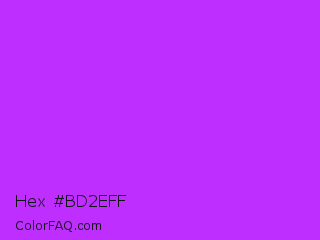 Hex #bd2eff Color is a normal purple color and the nearest color is Veronica #a020f0. Hex code #bd2eff and RGB value is rgb(189,46,255). In RGB color space, this color is composed of 74% red, 18% green, 100% blue, In CMYK color space, this color is composed of 26% cyan, 82% magenta, 0% yellow , 0% black , In HSL color space, this color has a hue angle of 281° , 100% saturation and 59% lightness.
