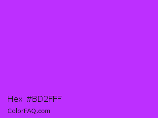 Hex #bd2fff Color is a normal purple color and the nearest color is Veronica #a020f0. Hex code #bd2fff and RGB value is rgb(189,47,255). In RGB color space, this color is composed of 74% red, 18% green, 100% blue, In CMYK color space, this color is composed of 26% cyan, 82% magenta, 0% yellow , 0% black , In HSL color space, this color has a hue angle of 281° , 100% saturation and 59% lightness.