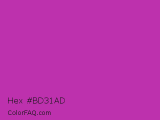 Hex #bd31ad Color is a normal magenta color and the nearest color is Byzantine #bd33a4. Hex code #bd31ad and RGB value is rgb(189,49,173). In RGB color space, this color is composed of 74% red, 19% green, 68% blue, In CMYK color space, this color is composed of 0% cyan, 74% magenta, 8% yellow , 26% black , In HSL color space, this color has a hue angle of 307° , 59% saturation and 47% lightness.