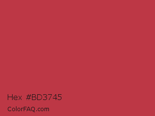 Hex #bd3745 Color is a normal red color and the nearest color is Brick Red #c62d42. Hex code #bd3745 and RGB value is rgb(189,55,69). In RGB color space, this color is composed of 74% red, 22% green, 27% blue, In CMYK color space, this color is composed of 0% cyan, 71% magenta, 63% yellow , 26% black , In HSL color space, this color has a hue angle of 354° , 55% saturation and 48% lightness.