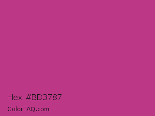Hex #bd3787 Color is a normal magenta color and the nearest color is Medium Red Violet #bb3385. Hex code #bd3787 and RGB value is rgb(189,55,135). In RGB color space, this color is composed of 74% red, 22% green, 53% blue, In CMYK color space, this color is composed of 0% cyan, 71% magenta, 29% yellow , 26% black , In HSL color space, this color has a hue angle of 324° , 55% saturation and 48% lightness.