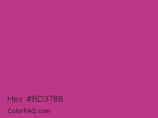 Hex #bd3788 Color is a normal magenta color and the nearest color is Medium Red Violet #bb3385. Hex code #bd3788 and RGB value is rgb(189,55,136). In RGB color space, this color is composed of 74% red, 22% green, 53% blue, In CMYK color space, this color is composed of 0% cyan, 71% magenta, 28% yellow , 26% black , In HSL color space, this color has a hue angle of 324° , 55% saturation and 48% lightness.