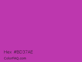 Hex #bd37ae Color is a normal magenta color and the nearest color is Byzantine #bd33a4. Hex code #bd37ae and RGB value is rgb(189,55,174). In RGB color space, this color is composed of 74% red, 22% green, 68% blue, In CMYK color space, this color is composed of 0% cyan, 71% magenta, 8% yellow , 26% black , In HSL color space, this color has a hue angle of 307° , 55% saturation and 48% lightness.