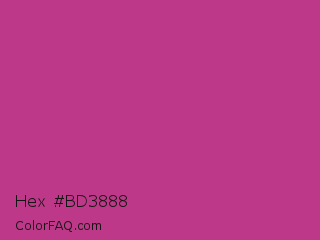 Hex #bd3888 Color is a normal magenta color and the nearest color is Medium Red Violet #bb3385. Hex code #bd3888 and RGB value is rgb(189,56,136). In RGB color space, this color is composed of 74% red, 22% green, 53% blue, In CMYK color space, this color is composed of 0% cyan, 70% magenta, 28% yellow , 26% black , In HSL color space, this color has a hue angle of 324° , 54% saturation and 48% lightness.