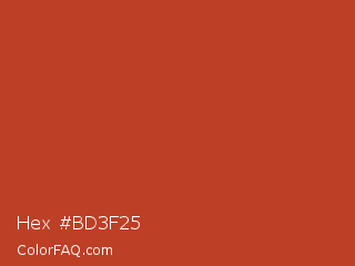 Hex #bd3f25 Color is a normal red color and the nearest color is Dark Pastel Red #c23b22. Hex code #bd3f25 and RGB value is rgb(189,63,37). In RGB color space, this color is composed of 74% red, 25% green, 15% blue, In CMYK color space, this color is composed of 0% cyan, 67% magenta, 80% yellow , 26% black , In HSL color space, this color has a hue angle of 10° , 67% saturation and 44% lightness.