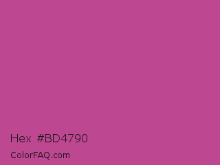 Hex #bd4790 Color is a normal magenta color and the nearest color is Mulberry #c54b8c. Hex code #bd4790 and RGB value is rgb(189,71,144). In RGB color space, this color is composed of 74% red, 28% green, 56% blue, In CMYK color space, this color is composed of 0% cyan, 62% magenta, 24% yellow , 26% black , In HSL color space, this color has a hue angle of 323° , 47% saturation and 51% lightness.