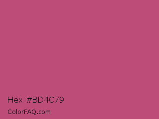 Hex #bd4c79 Color is a normal rose color and the nearest color is Fuchsia Rose #c74375. Hex code #bd4c79 and RGB value is rgb(189,76,121). In RGB color space, this color is composed of 74% red, 30% green, 47% blue, In CMYK color space, this color is composed of 0% cyan, 60% magenta, 36% yellow , 26% black , In HSL color space, this color has a hue angle of 336° , 46% saturation and 52% lightness.