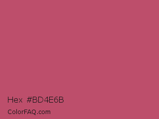 Hex #bd4e6b Color is a normal rose color and the nearest color is Popstar #be4f62. Hex code #bd4e6b and RGB value is rgb(189,78,107). In RGB color space, this color is composed of 74% red, 31% green, 42% blue, In CMYK color space, this color is composed of 0% cyan, 59% magenta, 43% yellow , 26% black , In HSL color space, this color has a hue angle of 344° , 46% saturation and 52% lightness.