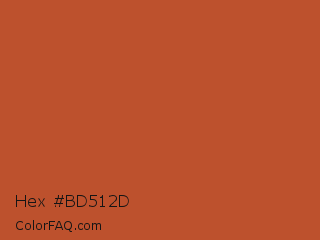 Hex #bd512d Color is a normal color and the nearest color is Tuscany #bd5e2e. Hex code #bd512d and RGB value is rgb(189,81,45). In RGB color space, this color is composed of 74% red, 32% green, 18% blue, In CMYK color space, this color is composed of 0% cyan, 57% magenta, 76% yellow , 26% black , In HSL color space, this color has a hue angle of 15° , 62% saturation and 46% lightness.