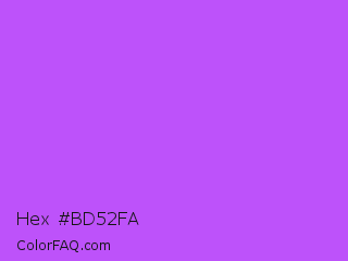 Hex #bd52fa Color is a light purple color and the nearest color is Medium Orchid #ba55d3. Hex code #bd52fa and RGB value is rgb(189,82,250). In RGB color space, this color is composed of 74% red, 32% green, 98% blue, In CMYK color space, this color is composed of 24% cyan, 67% magenta, 0% yellow , 2% black , In HSL color space, this color has a hue angle of 278° , 94% saturation and 65% lightness.