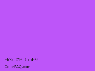 Hex #bd55f9 Color is a light purple color and the nearest color is Medium Orchid #ba55d3. Hex code #bd55f9 and RGB value is rgb(189,85,249). In RGB color space, this color is composed of 74% red, 33% green, 98% blue, In CMYK color space, this color is composed of 24% cyan, 66% magenta, 0% yellow , 2% black , In HSL color space, this color has a hue angle of 278° , 93% saturation and 65% lightness.