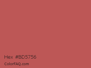 Hex #bd5756 Color is a normal red color and the nearest color is Fuzzy Wuzzy Brown #c45655. Hex code #bd5756 and RGB value is rgb(189,87,86). In RGB color space, this color is composed of 74% red, 34% green, 34% blue, In CMYK color space, this color is composed of 0% cyan, 54% magenta, 54% yellow , 26% black , In HSL color space, this color has a hue angle of 1° , 44% saturation and 54% lightness.