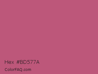 Hex #bd577a Color is a normal rose color and the nearest color is Tapestry #b05e81. Hex code #bd577a and RGB value is rgb(189,87,122). In RGB color space, this color is composed of 74% red, 34% green, 48% blue, In CMYK color space, this color is composed of 0% cyan, 54% magenta, 35% yellow , 26% black , In HSL color space, this color has a hue angle of 339° , 44% saturation and 54% lightness.