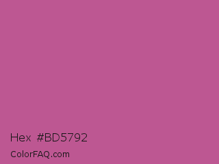 Hex #bd5792 Color is a normal magenta color and the nearest color is Mulberry #c54b8c. Hex code #bd5792 and RGB value is rgb(189,87,146). In RGB color space, this color is composed of 74% red, 34% green, 57% blue, In CMYK color space, this color is composed of 0% cyan, 54% magenta, 23% yellow , 26% black , In HSL color space, this color has a hue angle of 325° , 44% saturation and 54% lightness.