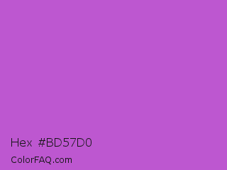 Hex #bd57d0 Color is a normal purple color and the nearest color is Medium Orchid #ba55d3. Hex code #bd57d0 and RGB value is rgb(189,87,208). In RGB color space, this color is composed of 74% red, 34% green, 82% blue, In CMYK color space, this color is composed of 9% cyan, 58% magenta, 0% yellow , 18% black , In HSL color space, this color has a hue angle of 291° , 56% saturation and 58% lightness.