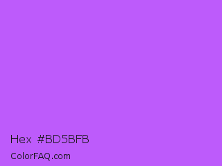 Hex #bd5bfb Color is a light purple color and the nearest color is Medium Orchid #ba55d3. Hex code #bd5bfb and RGB value is rgb(189,91,251). In RGB color space, this color is composed of 74% red, 36% green, 98% blue, In CMYK color space, this color is composed of 25% cyan, 64% magenta, 0% yellow , 2% black , In HSL color space, this color has a hue angle of 277° , 95% saturation and 67% lightness.