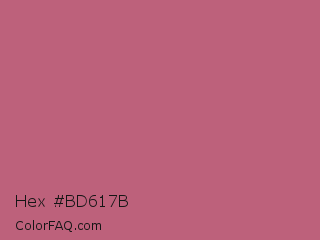 Hex #bd617b Color is a normal rose color and the nearest color is Rose Gold #b76e79. Hex code #bd617b and RGB value is rgb(189,97,123). In RGB color space, this color is composed of 74% red, 38% green, 48% blue, In CMYK color space, this color is composed of 0% cyan, 49% magenta, 35% yellow , 26% black , In HSL color space, this color has a hue angle of 343° , 41% saturation and 56% lightness.