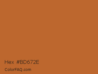 Hex #bd672e Color is a normal orange color and the nearest color is Ruddy Brown #bb6528. Hex code #bd672e and RGB value is rgb(189,103,46). In RGB color space, this color is composed of 74% red, 40% green, 18% blue, In CMYK color space, this color is composed of 0% cyan, 46% magenta, 76% yellow , 26% black , In HSL color space, this color has a hue angle of 24° , 61% saturation and 46% lightness.