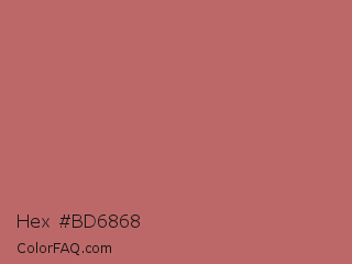 Hex #bd6868 Color is a normal red color and the nearest color is Contessa #c6726b. Hex code #bd6868 and RGB value is rgb(189,104,104). In RGB color space, this color is composed of 74% red, 41% green, 41% blue, In CMYK color space, this color is composed of 0% cyan, 45% magenta, 45% yellow , 26% black , In HSL color space, this color has a hue angle of 0° , 39% saturation and 57% lightness.