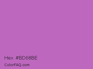 Hex #bd68be Color is a normal magenta color and the nearest color is Fuchsia Pink #c154c1. Hex code #bd68be and RGB value is rgb(189,104,190). In RGB color space, this color is composed of 74% red, 41% green, 75% blue, In CMYK color space, this color is composed of 1% cyan, 45% magenta, 0% yellow , 25% black , In HSL color space, this color has a hue angle of 299° , 40% saturation and 58% lightness.