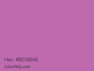 Hex #bd6bae Color is a normal magenta color and the nearest color is Pearly Purple #b768a2. Hex code #bd6bae and RGB value is rgb(189,107,174). In RGB color space, this color is composed of 74% red, 42% green, 68% blue, In CMYK color space, this color is composed of 0% cyan, 43% magenta, 8% yellow , 26% black , In HSL color space, this color has a hue angle of 311° , 38% saturation and 58% lightness.