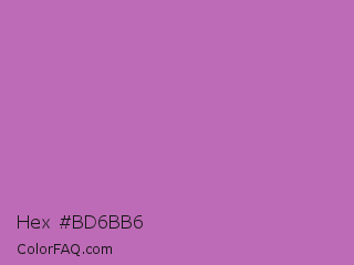 Hex #bd6bb6 Color is a normal magenta color and the nearest color is Sky Magenta #cf71af. Hex code #bd6bb6 and RGB value is rgb(189,107,182). In RGB color space, this color is composed of 74% red, 42% green, 71% blue, In CMYK color space, this color is composed of 0% cyan, 43% magenta, 4% yellow , 26% black , In HSL color space, this color has a hue angle of 305° , 38% saturation and 58% lightness.